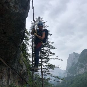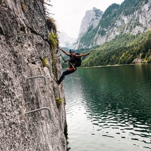 Hravá, krátká, cvičná, středně těžká ferrata Laserer Alpin Klettersteig (C) vede okruhem ve skalní stěně nad malebným jezerem Vorderer Gosausee v Solné komoře v rakouských Alpách. Vyzkoušíš si na ní lezení traverzem i v kolmé stěně, výstup po žebříku i přechod vzdušného lanové mostu.