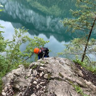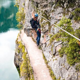 Ferata vede jako okruh, zpátky k parkovišti a restauraci vyrazte stejnou cestou nebo si udělejte pěknou procházku kolem jezera (3,5 km).