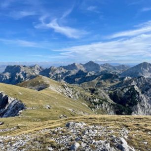 Z obou Maglićů se po zdolání této krátké, ale velice intenzivní trasy naskytne nádherný 360° výhled na další majestátní horstva na bosenské i černohorské straně. Na Maglići jsme sami. Sedlo mezi vrcholy je rovinaté a vhodné na pauzu v trávě. Vaříme oběd.