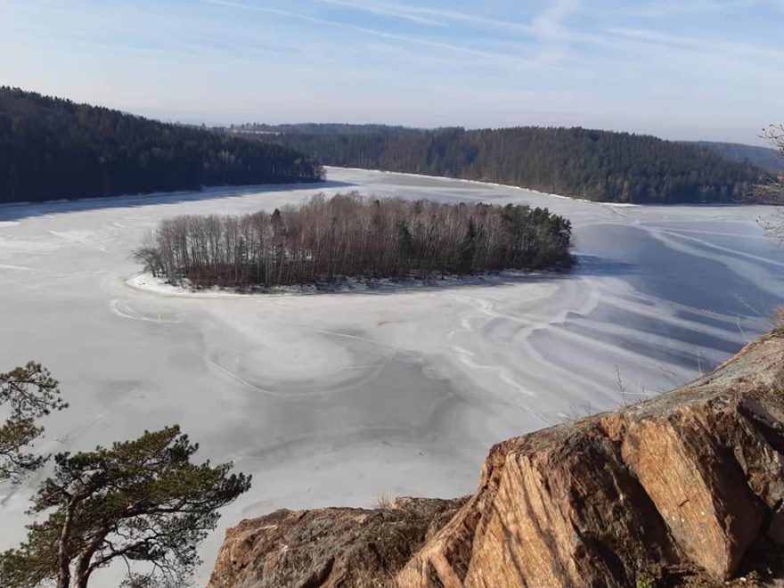 Pokračujeme po silnici dále přes hráz na rozcestí zelené a modré turistické značky Pod Ohebem. Po stovkách metrů, po uklouzané lesní cestě dojdeme ke zřícenině hradu Oheb z 11. stol. Z hradu se zachovaly některé části zdiva, avšak co nás nejvíce nadchne, je úchvatný, romantický pohled na zamrzlou hladinu Seče s jejím nejfotogenetičtějším místem, ostrůvkem, jedním z největších izolovaných ostrůvků v Česku. Pro nadšence geocachingu lze si na tomto malebném ostrůvku „odlovit“ kešku. Vzpomínám, jak jsem si půjčila šlapadlo a jela si pro úspěšný „odlov“.