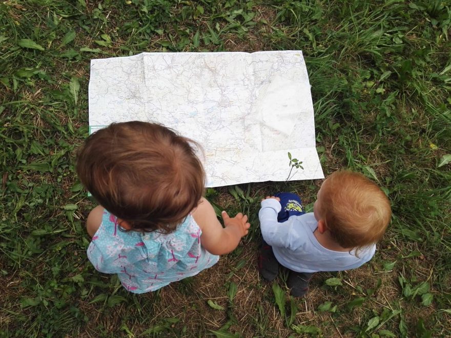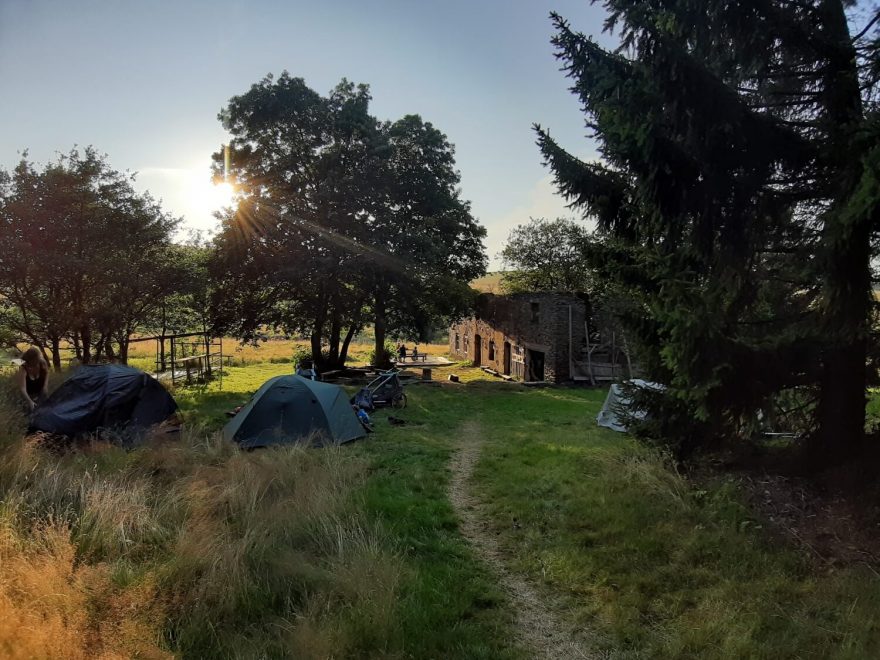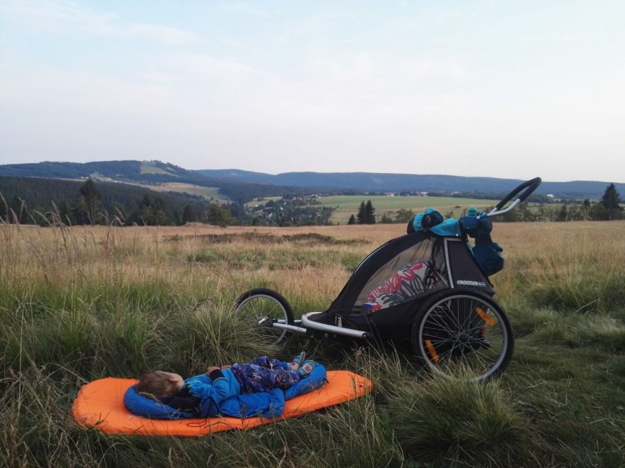 Těch kilometrů nás nakonec čeká mnohem více. V zápalu konverzace jsme si nevšimly odbočky a sešly pár stovek výškových metrů níže, než bylo potřeba. Strmé stoupání po neznačené trase. Tudy snad roky nikdo nešel. Děti už to ve vozících přestává bavit. Přidáváme do kroku. Konečně se před námi objevuje cedule „U Apolenky“. Jsme v cíli. Na prostorném plácku u lesa stavíme stany. Škoda jen blízkosti té silnice opodál. Ten závěrečný kopec nás i přes to dnešní pomalé tempo úplně odrovnal a my uléháme do stanů rovnou s dětmi.