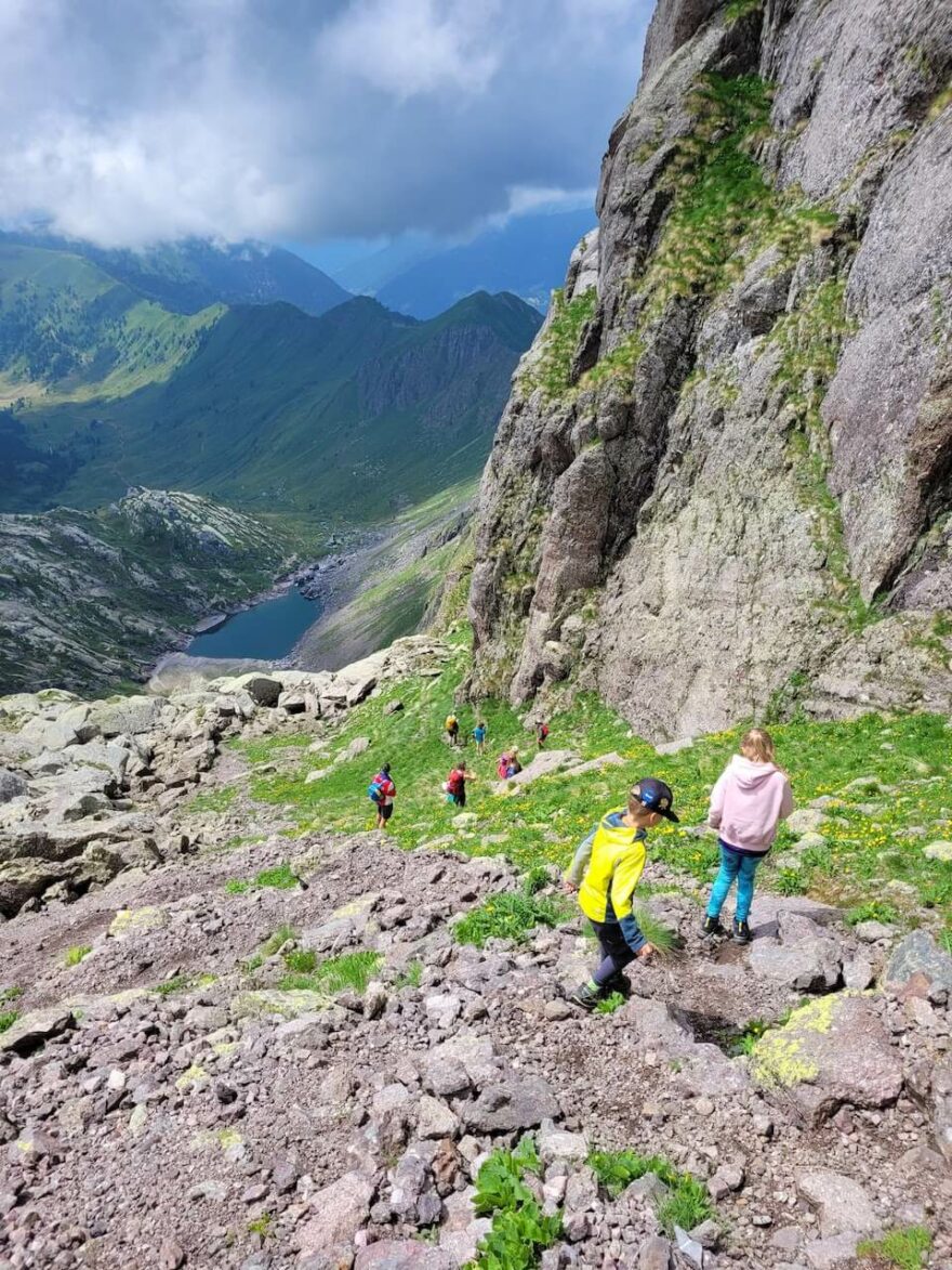 S dětmi jsme ten samý den vylezli na Pizzo dei Tre Signori (v GPX souboru neuvedeno – v mapě dohledáte). Nádherný kopec s řadou jemně technických úseků a minimální expozicí, který si děti maximálně užily. Ve vrcholové části několik úseků s řetězy, všechny děti zvládly bravurně. Pro sestup doporučuji použít stejnou trasu. Neznačená direttisima přímo k Lago di Sasso byla značně exponovaná, a ačkoli konec dobrý, všechno dobré, asi jsme měli jít okolo.