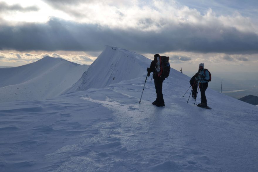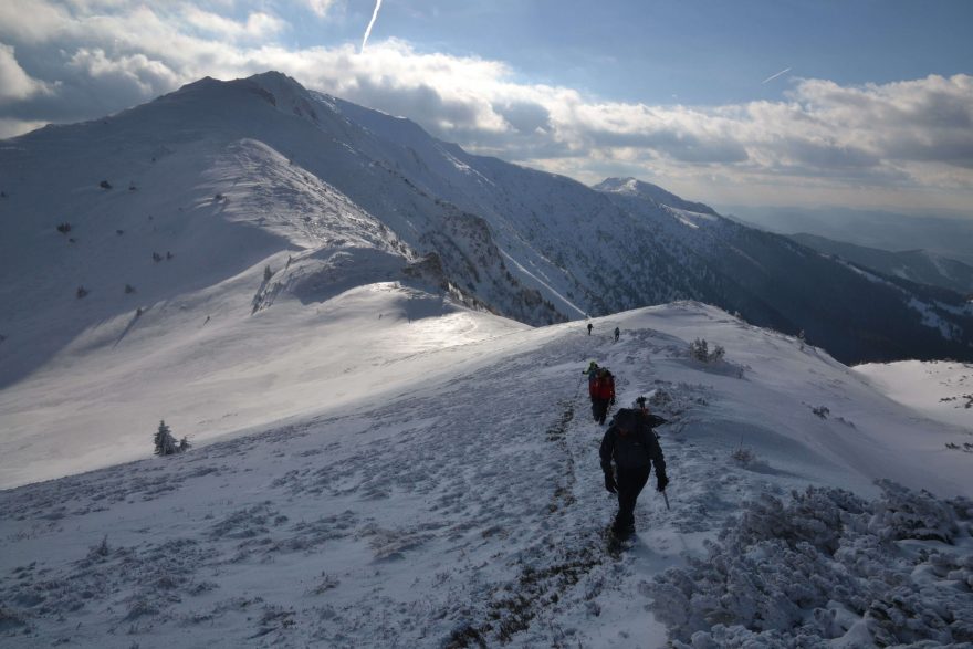 Po morálně náročném překonání tohohle strmého traverzu už pohodlně stoupáme na nejvyšší bod Malé Fatry, Velký Kriváň (1708 m). Samotný vrchol je pokrytý ledovou krustou a závěrečný úsek od odbočky je taky zralý na přezutí do maček. Vrcholová kochačka na zasněženou nádheru vůkol netrvá dlouho, ledový vítr štípe do tváří a po chvíli nás z vrcholu vyžene.