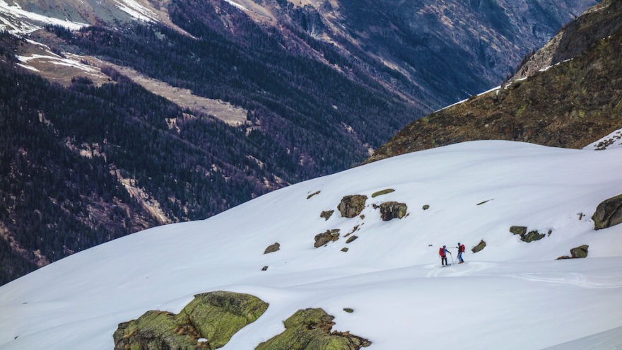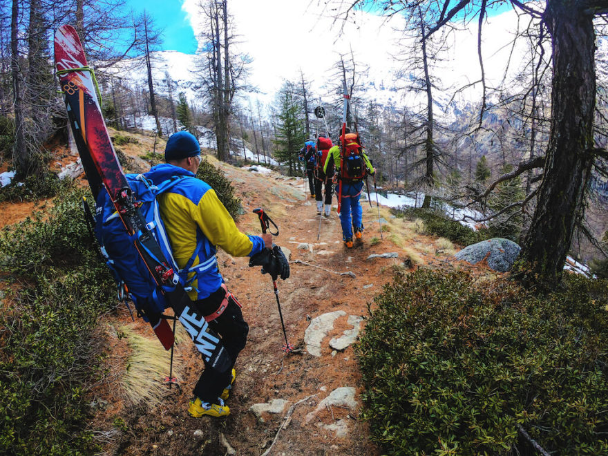 Auty zajíždíme téměř až na konec údolí Valsavarenche, kde je velké a jasně označené parkoviště pro návštěvníky chaty Rifugio Chabod, která bývá na skialpovou sezónu otevřená (zhruba půlka března – půlka května). Tam míříme i my. Je to nějaké dvě a půl hodinky (850 m+) a teď na začátku května je pohodlnější začít stoupat v teniskách a lyžáky zatím připnout do lyží na batohu. Jsme ve výšce 1 850 metrů a k čáře sněhu to máme asi 350 výškových metrů. Historická, kameny dlážděná cestička stoupá prudce nahoru v ostrých serpentinách a v lehkých teniskách rychle nabíráme výšku. Jaro je tady v plném rozpuku, horský les i louky se pomalu probírají ze zimního spánku, všude zurčí voda z tajících mas sněhu nad námi. To je doba, kterou mám v horách asi úplně nejraději!