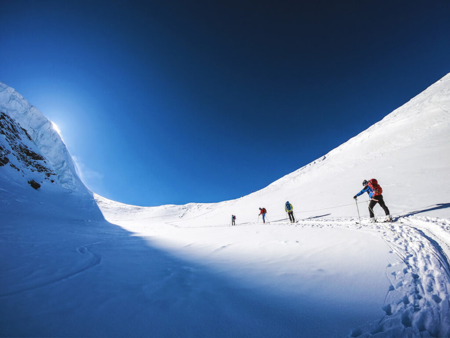 Samozřejmě druh i kvalita sněhu se mění, vystřídáme mnohá klimatická pásma a během pár desítek minut se přesuneme z vrcholné zimy až do začínajícího léta. Horní částí ledovce jedeme po tvrdém, zmrzlém a vyfoukaném sněhu, zatímco níže v ledovcovém údolí na nás i teď v květnu čeká prašan, který je tu sfoukaný z okolních plání.