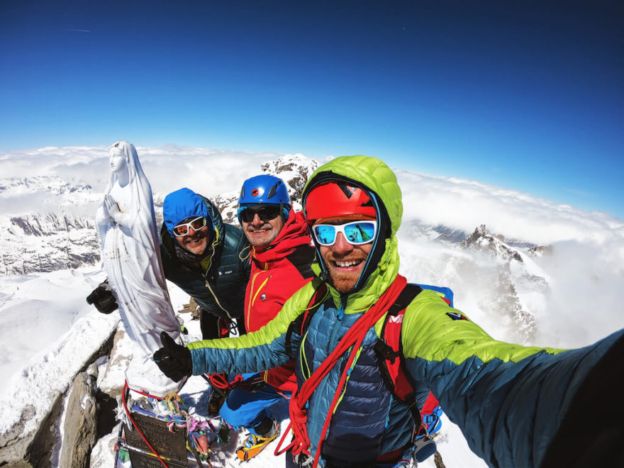 Míříme přímo na nevýrazné sedýlko ve vrcholovém hřebeni, kde necháváme lyže a hole a vytahujeme mačky a cepín. Znovu se navazujeme, tentokrát ale ne v dlouhých rozestupech jako na ledovci, ale hezky nakrátko, a čeká nás krátký skalní hřeben k vrcholu. Na několika těžších místech jsou nýty na dobrání, a tak těch několik nepříliš těžkých výšvihů překonáváme, rozdělení do dvou družstev po třech, úplně bezpečně a bez problémů. Pro kluky je to ale velký zážitek, kterým nasazujeme téhle velehorské skitúře korunu! V závěrečném traverzíku máme pod sebou v jednu chvíli dobrých 500 metrů vzduchu, ale hned po něm se konečně ocitáme na vrcholu samotného Gran Paradiso! Objímáme blesky ošlehanou sošku Madony na vrcholu a z výšky 4 061 metrů můžeme přehlédnout celé širé okolí. Tohle je opravdu nejvyšší bod tohoto koutu Alp. Máme štěstí na počasí, je 10:30, už není velká zima, a tak se můžeme kochat do sytosti.