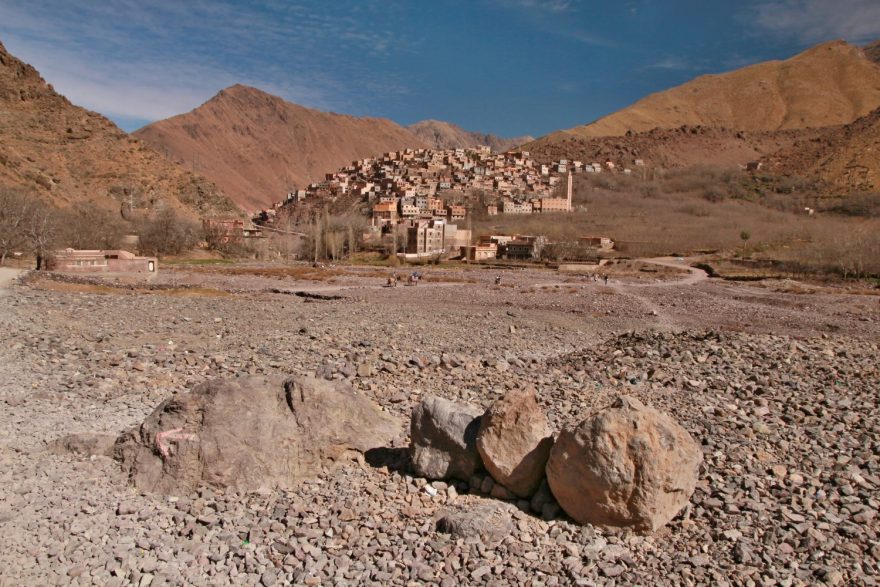 Po propletení se úzkými uličkami přicházíme na prašnou cestu, vedoucí k posledním stavením na konci údolí. Okolí je naprosto vyprahlé, ojedinělé stromy tu vytrvale zápasí o to málo vody, které tu je. I přesto, že je únor, jdeme v tričku, což v tuhle dobu nebývá úplně zvykem. Stejně jako u nás byl i v Maroku v létě 2015 nedostatek vody. Nepřišly sem ani podzimní a zimní srážky, a tak tu po cestě, která je běžně skialpovou trasou, jdeme v sandálech. Výstup je tak sice snazší, ale v celé zemi přináší nedostatek sněhu velké problémy.