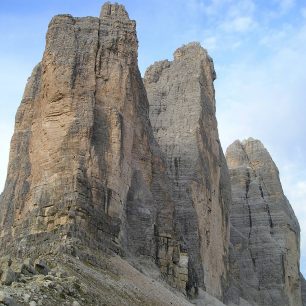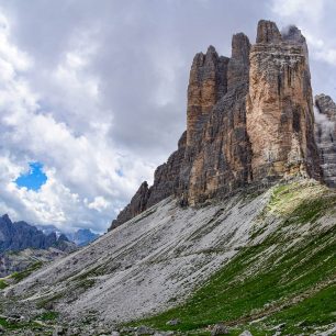 Cesta nyní mírně klesá dolů na náhorní planinu; po pravé straně se táhne rozeklaný skalní hřeben Bodenknoten, z něhož vyčnívá vrcholek Paternkofelu (Monte Paterna) a my po 1.5 km vystoupáváme k chatě Drei Zinnen-Hütte ve výšce 2405 metrů.