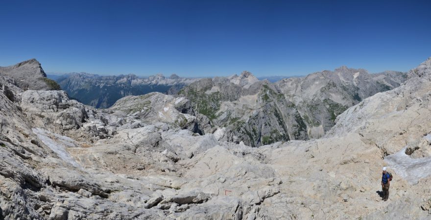 Od vrcholové věžičky se otvírá pohled na majestátní vápencové království. Úctu vzbuzuje také sestupová trasa po úzkém zajištěném hřebeni přes Malý Triglav. Cesta je to nádherná, ale v sezoně se jedná asi o nejvytíženější cestu Slovinska a půjdete prakticky ve frontě. Sestoupit se dá buď k Triglavskému domu na Kredarici, nebo k Domu Planika (asi hodinu).