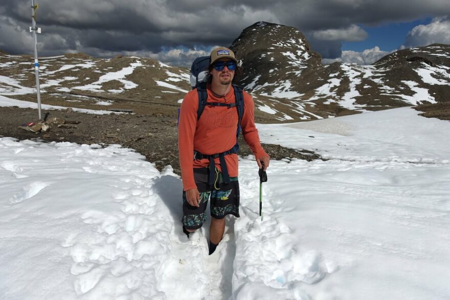 Úvodní etapa vedla přes vápencové pohoří Rätikon na pomezí tří států: Rakouska, Švýcarska a Lichtenštejnska. Rozmary počasí nám dávaly zabrat. Na hřebeni nás chytla bouřka, další den vytrvalý déšť a nad dvěma tisíci metry sněžení. Na skalní římse před ledovcem Brandner mi kousek za zadkem projela hlinito-kamenitá lavina. Z kopců mezi Landauer Hütte a Gargellenem zase padaly klasické sněhové laviny – čtvrtého srpna. Premiéru pod pevnou střechou jsme si odbyli na Mannheimer Hütte. Tam jsme dostali první poučení o nutné rezervaci v době covidové. Samozřejmě jsme to věděli, ale jak rezervovat, když netušíte, kam dojdete večer.