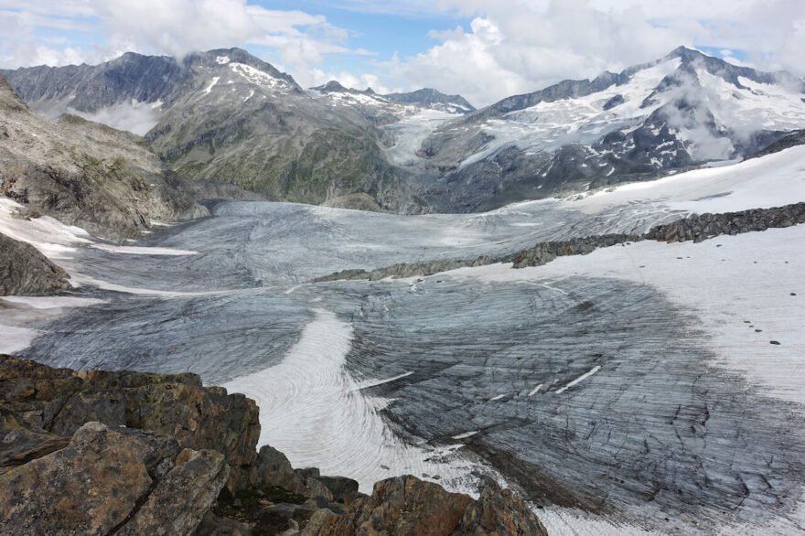 Za vytrvalého deště jsme přešli první část ledovce Obersulzbachkees, sešplhali po špatně jištěné ferratě k ledovcovému jezeru a po poctivých drátech vyšplhali na Kürsingerhütte, jedno z tradičních výchozích míst na třítisícový Grossvenediger. Ráno se na chvíli vyčasilo, tak jsme se mohli pustit do největší výzvy. Jeden most přes trhlinu na hlavní části Obersulzbachkees jsme museli přeplazit, ale jinak byl průchod celkem bezpečný. Až na mlhu a sníh, které se na nás snesly v sedle Venedigerscharte, s výškou 3407 m nejvyšším bodě treku. Guida s klientkou vracející se z vrcholu jsme pobavili odpovědí na otázku, zda jdeme nahoru: „Nemusíme na každý kopeček, my jdeme do Bratislavy“. Přes Neu Prager Hütte jsme pokračovali až na St. Pöltner Hütte. Chatař byl vyděšený, že přišli hosti. Dokonce volal na policii, zda nás může ubytovat. Nakonec se z něj vyklubal příjemný chlapík, jídlo bylo dobré a ceny férové.