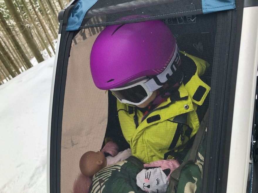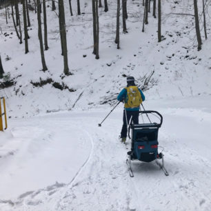 Sjezdy jsou ale zážitek především pro děti (pokud zrovna nespí). Kabina je kompletně krytá a oproti např. bobům je umístěna v dostatečné výšce nad povrchem. Uvnitř je dostatek místa na deku nebo fusak. Dítě tak zůstává v teple a výhled z „kokpitu“ je příjemným bonusem. Helma na sjezd je u dítěte nezbytná!