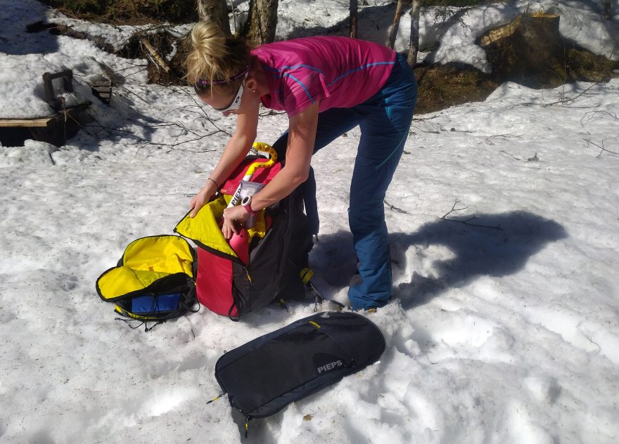 „Tělo batohu ukrývá 3 prostory, které umožňují krásné třízení materiálu. Uvnitř se lehce směstnaly mačky, lopata, sonda, lahev s vodou, svačina, lyžařské brýle, bunda, vesta, náhradní kalhoty a rukavice. Když byl batoh naplněn na celý den, tak se párkrát stalo, že se mi začal rozjíždět zips, který držel samotný airbag. V tu chvíli ale stačilo celý zips přezipsovat a vše bylo opět v pořádku.