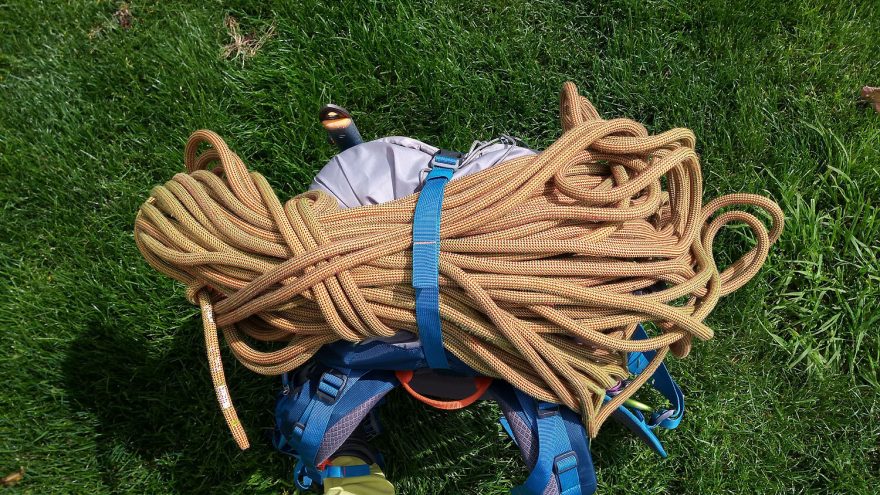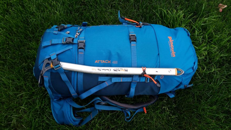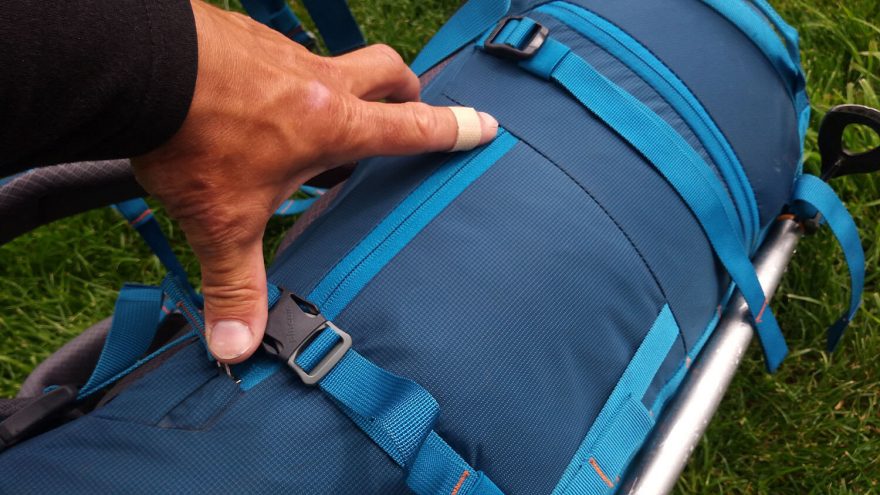 Spony je možno dobře rozepínat i v rukavicích. Popruhů na batohu nejdete celou baterii a je možno jej stahovat nebo na něj zavěšovat další vybavení. Pod hlavní popruhy, které vedou i přes čelní panel dáte karimatku, sněžnice či hole. Pod víkem je fixační popruh na lano. Pro fixaci lyží je na spodní komoře ještě extra popruh na založení lyží a vejdou se do nich i opravdu široké lopaty. Cepíny se fixují velmi jednoduše a hroty jsou částečně chráněny extra materiálem. Topůrka se zajišťují pomocí pružné tkanice a samosvorky.
