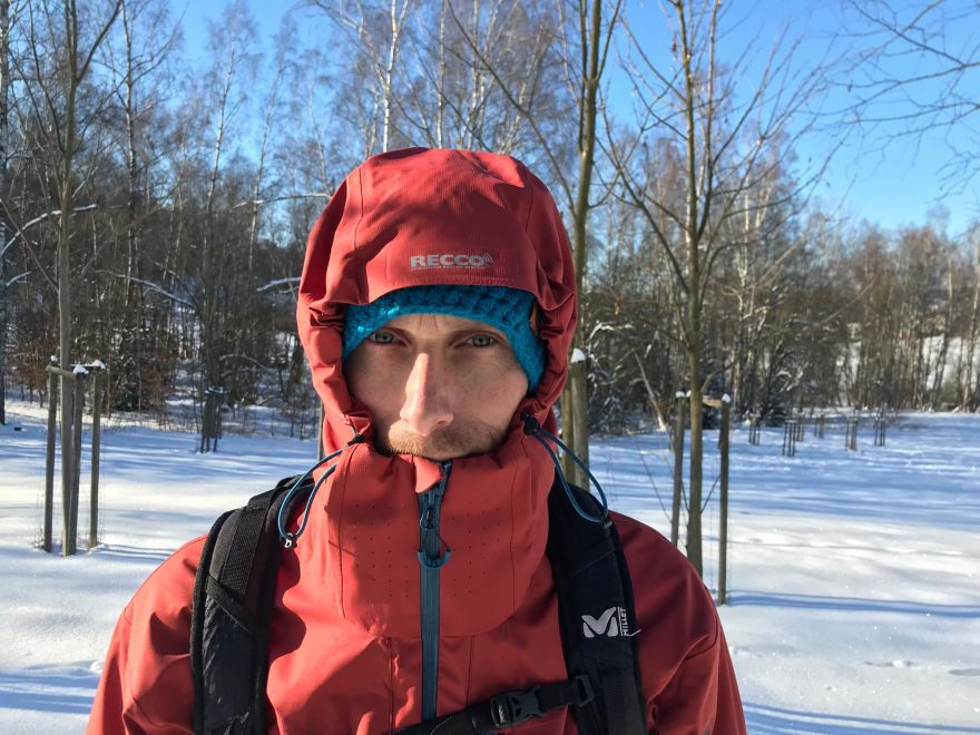 Během testu jsem několikrát zažil počasí na „Vrbatu“ a kapuce přišla pokaždé vhod. Používal jsem jí rád a bohužel často. Musím pochválit jednoduché nastavení pomocí tříbodového systému využívajícího elastických gumiček a svorek. Kapuce je dostatečně velká, v případě špatného počasí jí dokážete přetáhnout i přes lyžařskou helmu. Když použijete kapuci a zapnutý vysoký límec, tak se ochrana proti větru stává téměř 100%. Součástí kapuce je pevný štítek, který obsahuje vyhledávající reflektor Recco – v současné době stále častěji používaný prvek na lyžařském oblečení. Označil bych ho jako doplněk v případě zavalení lavinou. Přece jenom než dorazí Horská služba s detektorem, tak nějaký čas uplyne a kamaráda s pípákem, lopatou a sondou tento systém nenahradí. Součástí límce je microfleece, který se stará o Vaši bradu jako aloe o dětskou prdelku. Materiál na límci je v oblasti pusy perforovaný a částečně umožní dýchání přes límec.