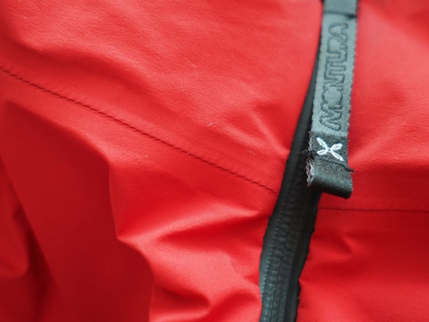 Svrchní materiál bundy se při prvním doteku zdá velice jemný, ale jak se během testování na skalách ukázalo, je i velice odolný. Švy na nepromokavých částech bundy jsou podlepeny. Na kapuci, ramenou a hrudi najdeme bezpečnostní reflexní prvky. Tři kapsy uzavírají voděodolné zipy YKK s dlouhými táhly, takže není problém obsluhovat je i v rukavicích. Hlavní zip je také voděodolný. Na bundě nenajdeme žádná zdrhovadla. V lemech rukávů, kolem boků i v kapuci jsou všity pruženky, které se o přilnavost okrajů postarají samy. Kapuce je dostatečně velká na to, aby se pod ni vlezla i skialpová či lezecká přilba.