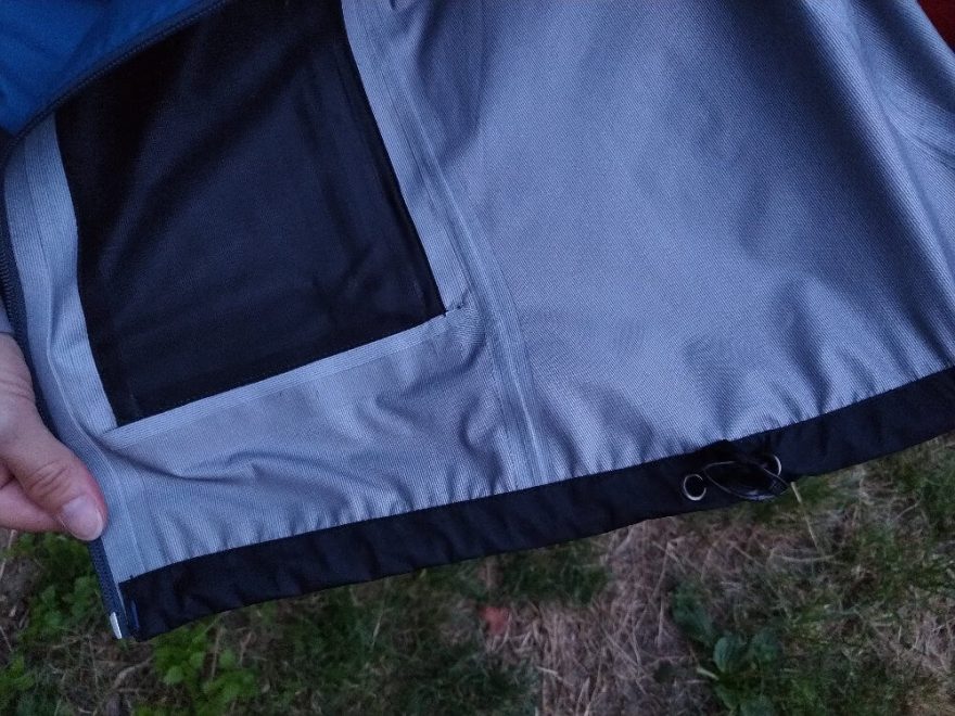 Rukávy jsou šité tak, že přes hřbet ruky je látka delší a do oblouku, zato u dlaní je krátká. To se mi zdá výhodné při držení se zábradlí, nebo při držení turistických hůlek. Rukávy jsou zakončené suchými zipy pro nastavení vhodného obvodu. Rukávy jsou dost široké, aby se tam vešla i spodní vrstva. Tato bunda je turistická, tím jen chci říct, že pod kapuci se nevejde helma. Ani lezecká, ani cyklistická. Zkoušela jsem to. Tak jako rukávy i spodní obvod bundy je zakončen pevnou tvrdší látkou. Touto látkou prochází gumičky na stahování. Ano, i spodní lem bundy je stahovací.