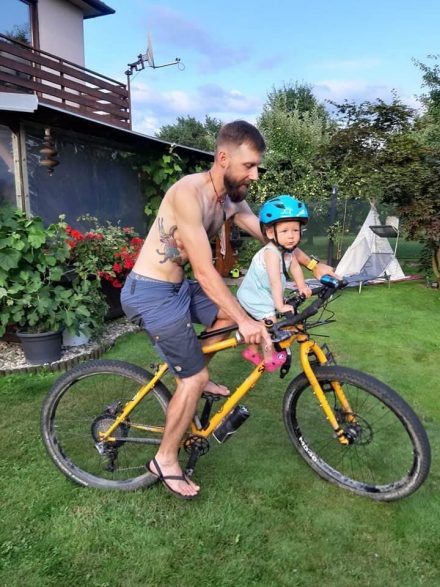 Aby ale testování mělo vypovídající hodnotu, půjčil jsem Shotgun Pro kamarádovi Milanovi, který má kluka ve věku 2,5 let. Na užívání Shotgun Pro napsal následující: „Sedačka je super, jde připevnit na jakékoliv kolo a nepoškodí rám. Největší výhodu vidím v tom, že můžu šlapat bez omezení a vytáčení kolenou do stran. Na gravel biku šla znatelně znát změna těžiště, oproti tomu se mi daleko lépe jezdilo na celoodpruženém biku. Na změnu těžiště se ale dá zvyknout. Protože mám zkušenost s pěnovou sedačkou na horní rámovou trubku, tak mi u Shotgunu chyběla možnost připoutat dětské nohy ke stupátku, takže může hrozit, že dítěti nohy vypadnou nebo je vytáhne a dostanou se tam, kam nemají.“