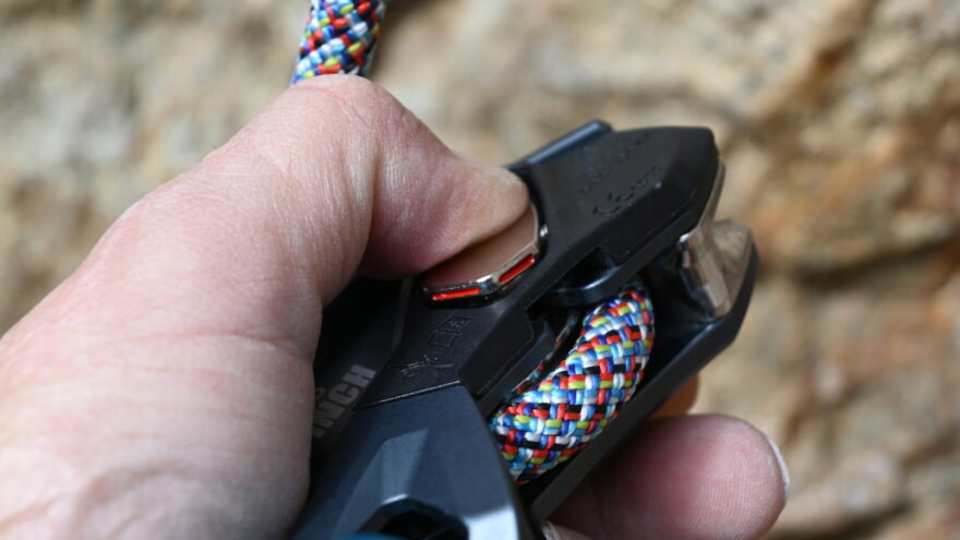 Lano se do jistítka vkládá jednoduše vyklopením bočnice. Ta je proti samovolnému otevření zajištěna a k otevření je nutné stisknout boční pojistku. Ta je při nedovření označena červenou barvou, která by vás měla upozornit, že bočnice není dovřená. Vše se dá naučit i jednou rukou – třeba je cvik (takový jako při otevření Zippo zapalovače). Po otevření bočnice je vidět ocelová vačka – srdce jistítka. Vložení lana je označeno piktogramy. Lezec a jistič. Mě osobně se osvědčilo držet lano vedoucí k lezci a začít vkládáním z jeho strany. Pak to dokončit směrem k jistící ruce. Ano. Podařilo se mi to založit i mimo určené místo pro vložení lana. To je třeba si pohlídat. Pak už stačí vrátit bočnici sklopit zpět a připojit k jistícímu oku úvazku šroubovací karabinou. Nebo i jinak?