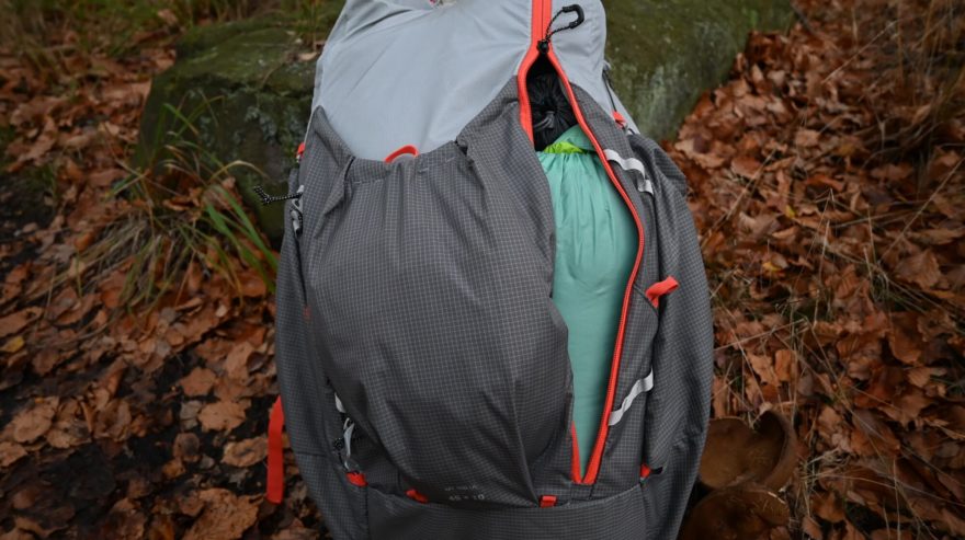 Hmotnost prázdného batohu 1.3 kg se může zdát na první pohled, že nepatří do kategorie ultra. Osobně za ultra považuji batohy do jednoho kilogramu, avšak i tento batoh o objemu 45+10 l umí snížit svoji hmotnost, a to o rovných 20 dkg. Což není vůbec málo, a tak se k magické hranici 1000 g blíží. Na první pohled zaujme rozhodně odvětranými zády, velkými 3D bočními kapsami a velkorysým bočním vstupem po celé délce batohu i s možností úplného otevření čelního panelu. Dále tento batoh nabízí i připnutí různého turistického náčiní a potřeb. Buď přímo na různé úchyty nebo za pomocí extra dodávaných univerzálních popruhů.