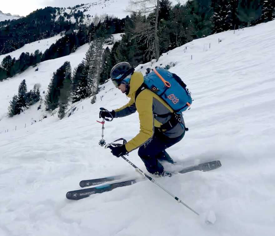 Svrchní materiál bundy je ošetřen vodoodpudivou ekologickou svrchní úpravou PFC FREE, která zamezuje nasákavost materiálu a navlhnutí izolační výplně. Tento svrchní materiál se jmenuje Airlite a je opravdu tenoučký a bundě nepřidá ani gram navíc. Zároveň mám po delším testování pocit, že to není žádná chudinka a něco vydrží. Nepotrhaly ho lyže ani cepín za batohem, výborně odolává i na hodině exponovaných místech jako konce rukávů a lokty. Ze zkušenosti vydrží i rozumnou dávku vlhkosti. Déšť asi ne, ale vlhkou mlhu, nebo čerství prase určitě ano a v kombinaci s tím, že opravdu neprofoukne je pak díky tomu bunda moje hlavní svrchní vrstva během většiny dní na lyžích.