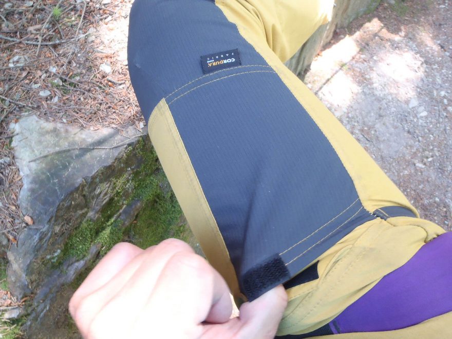 Nohavice jsou zakončeny jednoduchým způsobem, čili pouhým založením a jejich zkrácení je tak otázkou okamžiku, čehož jsem využil. Kolena jsou předtvarovány a není tak problém hodit nohu za hlavu, když to uděláte. A navíc jsou zesílena odolnou Cordurou, což oceníte zejména ve spárách či komínech. Technický střih s krokovým klínem neomezuje v pohybu při lezení a dalších aktivitách. A na pravé nohavici je i poutko pro čistící kartáček!