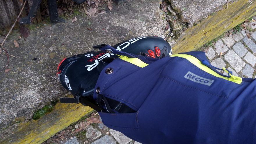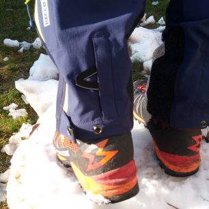 Nohavice jsou ve spodní části vybavené zipy se dvěma protisměrnými jezdci a extra otvorem, který umožňuje jak rozepnutí nohavice při obouvání a zouvání, tak snadný přístup k přezkám skialpových bot a jejich snadné přepínání. Tento speciální otvor krytý suchým zipem je určen pouze pro určitý typ skialpové obuvi a to takový, který má v patní části páku na fixaci komínu. Doporučuji na základě tohoto testování si vyzkoušet a ověřit dostatečnou šířku nohavic a případně i polohu páky skialpové boty vůči otvoru v nohavici.