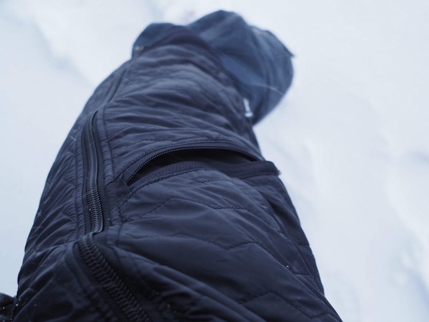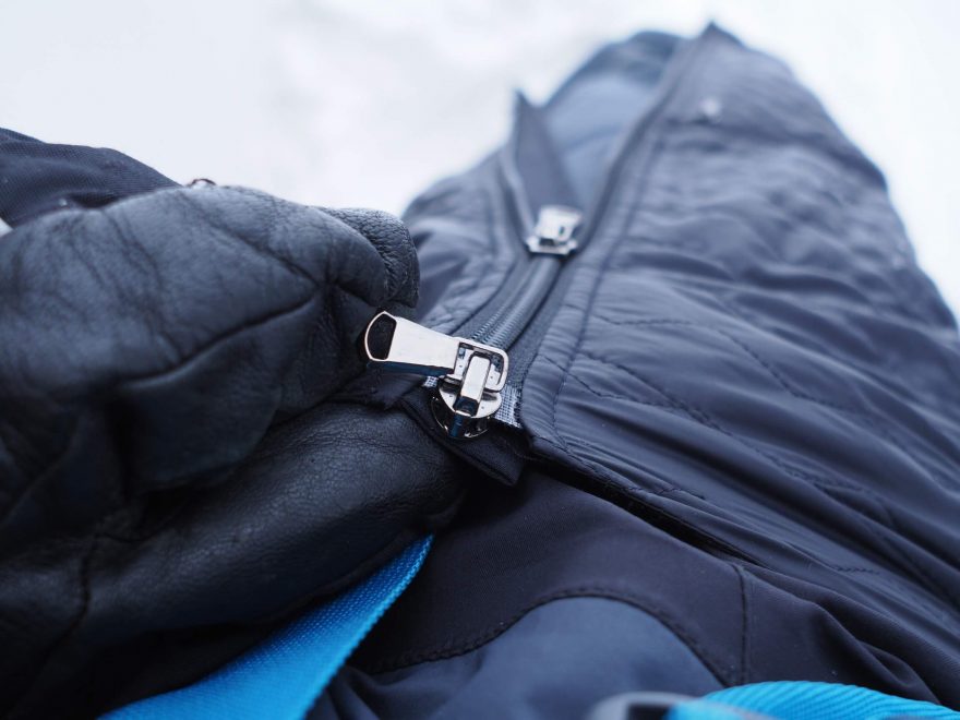 Šortky jsou ušity v univerzální černé barvě a nerozlišené zipy, tak za ztížených podmínek dokáží potrápit. Příště jsem už byl lépe připraven a kraťasy oblékal postupně: prvně rozepnout jednu stranu, nasadit na nohu, zapnout a pokračovat druhou nohou. K dokonalosti používání si stačí zapamatovat, které z táhel dvoucestného zipu použít pro rozepnutí kraťasů. Pamatujte: od kolene k pasu. Ačkoliv táhla nejsou nijak prodloužena, je s nimi manipulace v rukavicích docela dobrá.