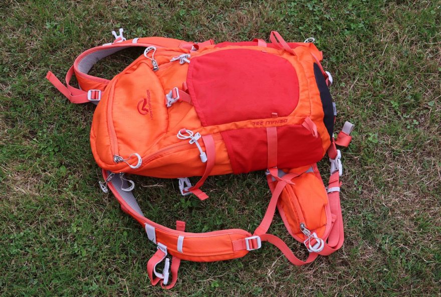 Zádový systém je v ose hladký, zatímco po obou stranách je varhánkovitě profilovaný s krytím řídkou síťovinou. Řešení je to zcela vyhovující během letního testování. Chtělo by to ještě vyzkoušet, jak se budou záda Denali 25 chovat v zimním období při sněžení. Vertikálně nejsou záda batohu velikostně nastavitelná, což je u této velikosti normální. Ramenní popruhy jsou délkově přizpůsobitelné na různě vysoké postavy od dětí až po dospělé různé výšky. Ramenní popruhy jsou úzké a odlehčené s povedeným polstrováním vnitřních částí. Fixace je v obvyklém uspořádání, když nahoře je vertikálně posuvný hrudní popruh, kdy je v jeho přezce integrována malá píšťalka. Bederní popruh je hmotnostně minimalistický, a přesto široký natolik, aby měl po obou vnějších částech dvě zipy uzavíratelné kapsy. Spínání bederáku je podle preferencí uživatele buď v ose těla nebo asymetrické.