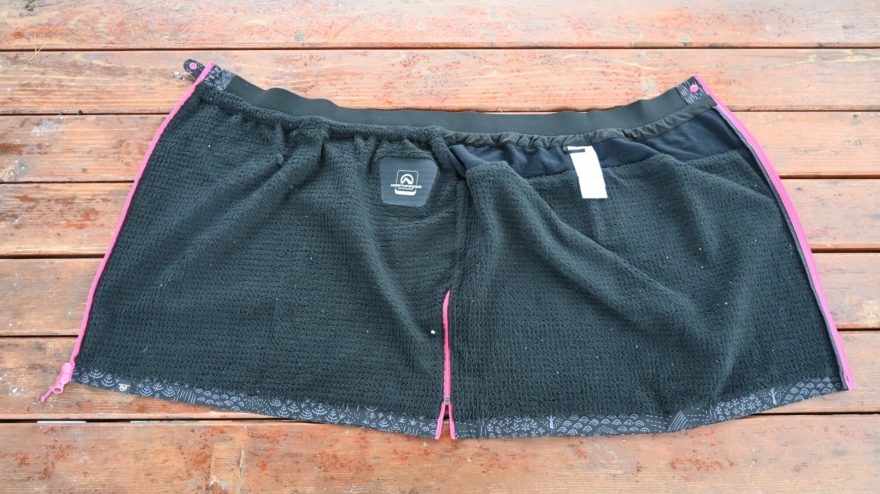 Izolační materiál je po celé ploše sukně, kromě úzkého pruhu na bedrech. Sukně je opatřena poutkem pro zavěšení – drobný, ale milý detail.