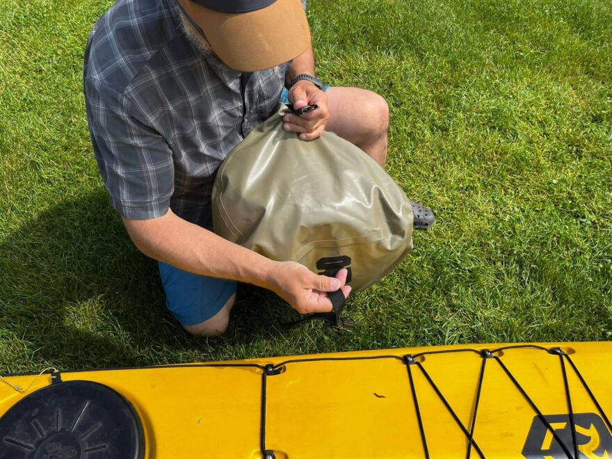 Přístup do útrob tašky je rychlý. Dřív, něž řeknete eien, zwei, drei. Zavírání tašky je rolovací. Konce po zarolování se zajišťují plastovou sponou na popruhu, který dovoluje povolení či dotažení. Dále je celé rolování zajištěno dalšími dvěma popruhy, která zároveň fungují jako kompresní. Okraj rolovacího uzávěru je vyztužen dvěma plastovými lištami tak, aby nedocházelo k samovolnému zpětnému „vyrolování“.
