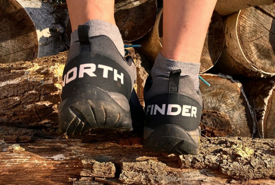 Aby toho nebylo z hlediska nadstandardní grafiky a viditelnosti i za zhoršených světelných podmínek málo, tak zvýšené gumové lemování na patách bot je opatřeno velkými bílými nápisy North na levé a Finder na pravé botě. Toto řešení úspěšně doplňuje odrazné pásky na oblečení, takže zezadu jsou při osvětlení potmě krásně vidět „kmitající“ nápisy North a Finder.