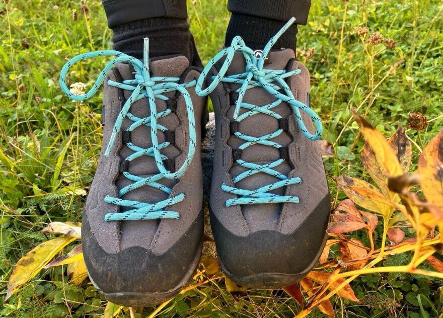 Zatímco u dámské verze Mana jsou základní tkaničky ideálně dlouhé, u pánských bot by jejich délka mohla být o 5 až 10 cm kratší. Takto se oka uzlu i konce tkaniček při každém kroku pohybují jen těsně nad zemí. To nevadí v terénu bez překážek, ale při průchodu houštím, vysokou trávou, apod. mají oka uzlu tendenci se zachytávat a rozvazovat. Jestli to není tím, že mám úzkou nohu a nízký nárt? Takže si poradím a udělám o jeden uzel navíc. Vyřešeno.