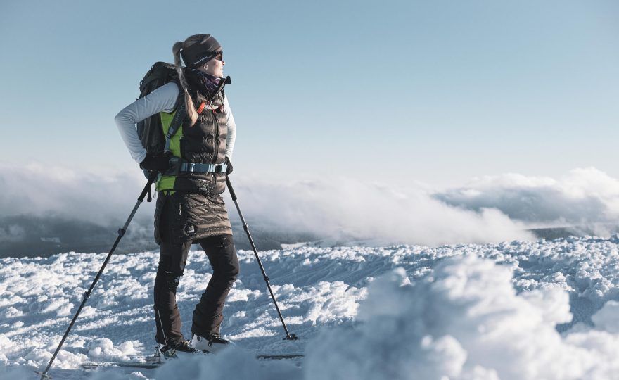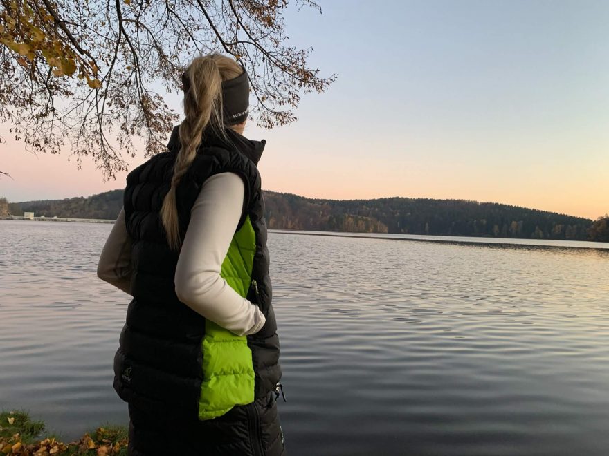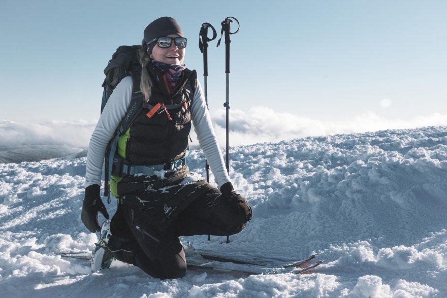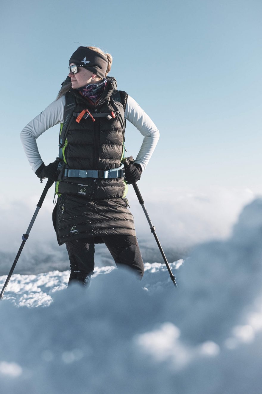 Péřový set jsem využila hlavně při skitouringu v Krkonoších a na běžných výletech. Nejsem úplně zmrzlík, takže jsem set oblékala ve větší nadmořské výšce, kde už pofukovalo, nebo jsem mohla při výstupu prostydnout. Vesta má skvělý tepelný komfort, neprofoukne, opravdu vás drží v teple a je příjemná. Do vysokého límce se „zachumláte“.