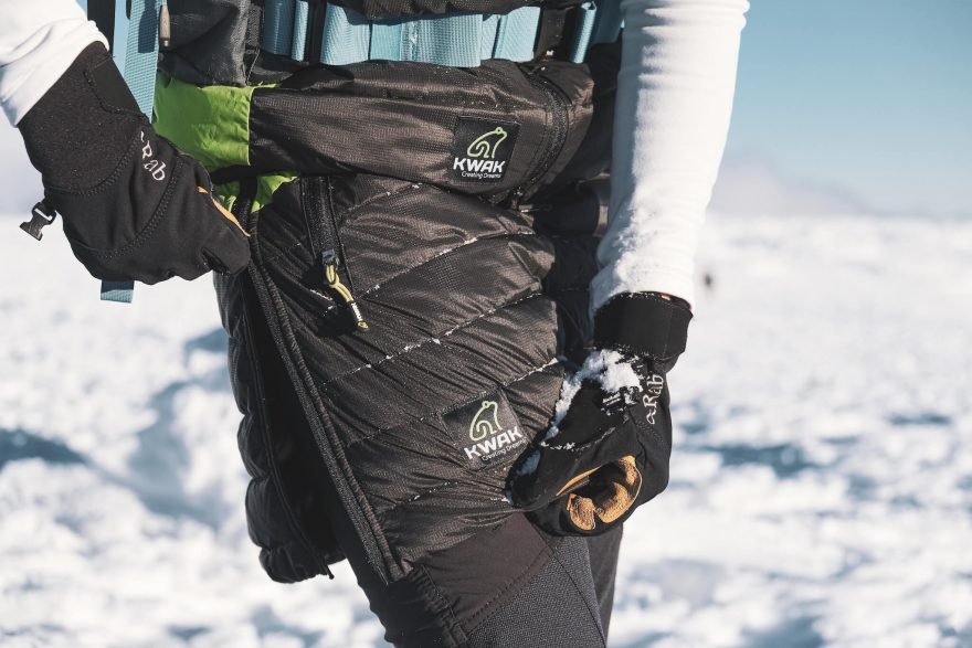 Péřová sukně má v zadní části pasu protiskluzový pás a čtyři očka po obvodu na případný pásek, takže sukně drží stále na svém místě. V přední části jsou opět dvě kapsy s obráceným zipem, kapsy jsou dost velké, např. na mobilní telefon. Na každé straně je oboustranný zip. Při malém rozepnutí vás sukně neomezuje v pohybu. Když si potřebujete sukni obléknout přes např. softshellové kalhoty, stačí sukni na jedné straně rozepnout úplně a pohodlně obléknout. Logo KWAK v pravé dolní části jako u vesty. Místo přišití loga mají oba dva produkty stejné, takže k sobě hezky ladí.