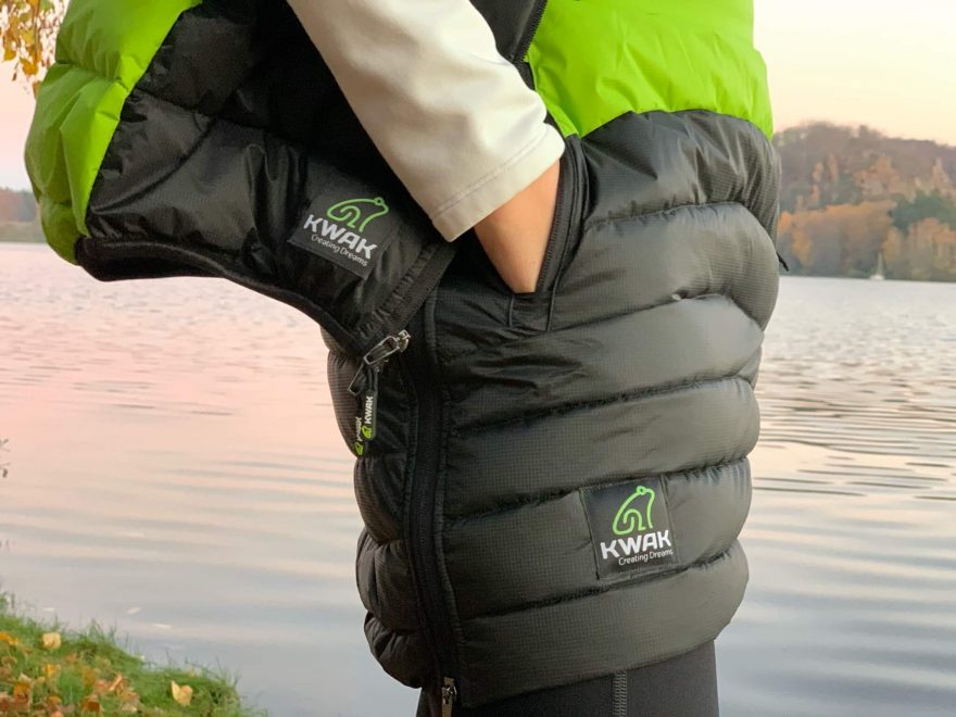 Jak už jsem zmiňovala výše, pod ruce se mi tentokrát dostal péřový set od české značky KWAK. Skládá se z vesty a sukně. Péřový set má dámský střih, v sukni vám dokonce vyniknou boky, což určitě každá ráda oceníme. Před koupí produktu si nakonfigurujete úplně vše, co vás napadne. Zaslala jsem své míry, vybrala barvu produktu, zipů, střih a jestli si přeji u vesty kapuci. Prostě vám přijde péřový set přímo „na míru“. Komunikaci s „panem KWAKEM 🙂 “ bych opravdu ráda vyzdvihla.