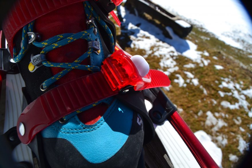 Upínání sněžnic lze velikostně regulovat pomocí textilního pásku na patě. Rozsah velikostí se pohybuje od 35 do 49, takže sněžnice jsou vhodné i pro větší děti, nebo horalky s nohou Popelky, ale i pro chlapy jak hora. Klouzání podrážky zabraňuje gumová podložka s hroty. Finální upevnění boty je zajištěno ráčnami jako u snowboardového vázání. Za několik túr se mi ráčny ani jednou nepovolily. Obuv doporučuji pevnější pohory i z důvodu případné zimy. Sněžnice mají určení pro pravou a levou nohu, ale není to na nich uvedené, takže člověk musí dávat pozor, kterým směrem se ubírá prostor pro botu.