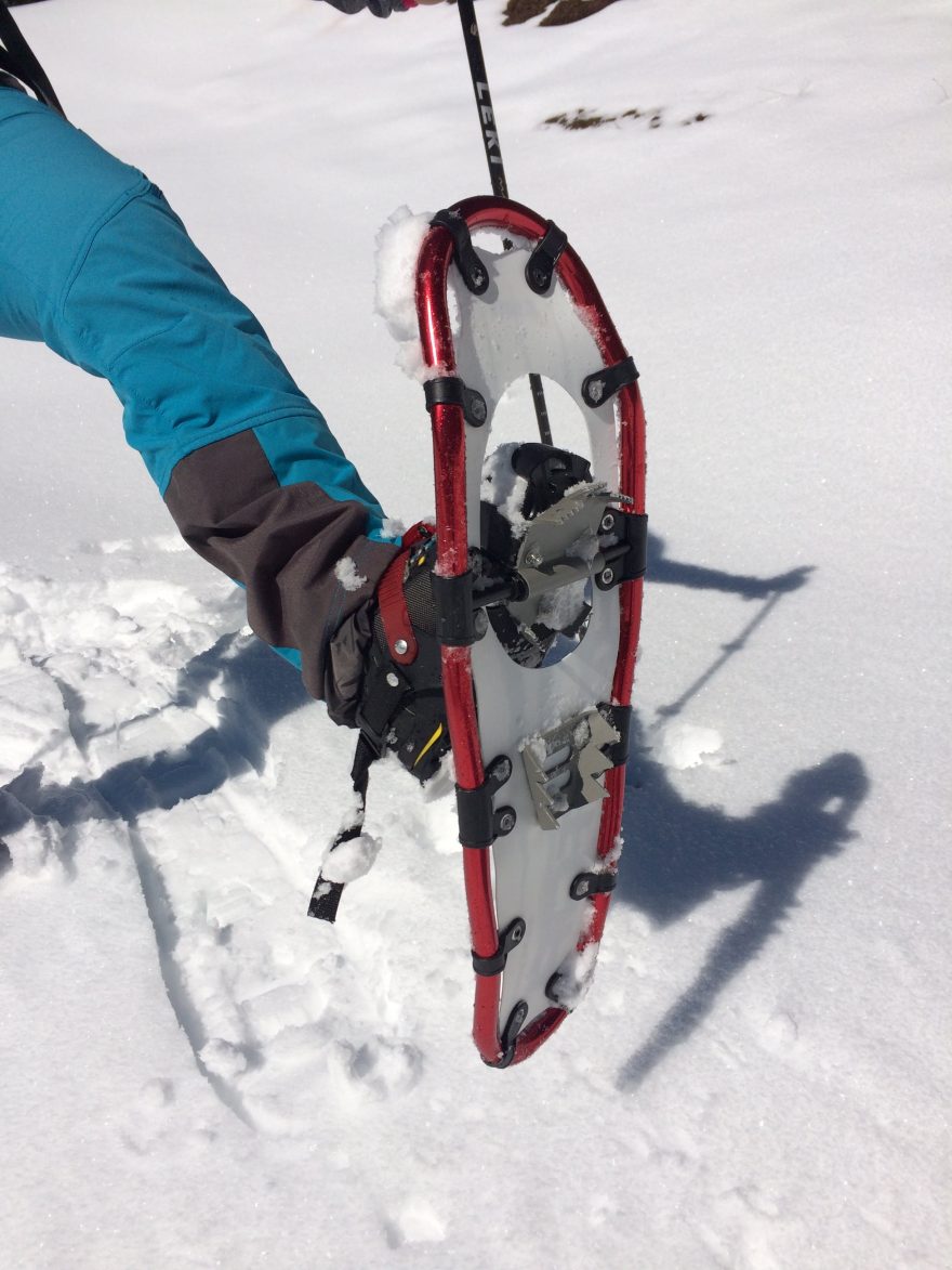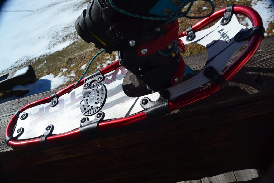 Hliníkový rám sněžnic Yate Raptor je pevný a lehký. Nekroutí se. Nosná plocha je plastová a sníh se na ní vůbec nedrží. Univerzální hroty zase zajišťují snadný pohyb ve zledovatělém nebo strmém terénu. Upevňování na botu je snowboardového typu pomocí pásků s ráčnami a perfektně drží. Co mi naopak ale trošku chybělo?