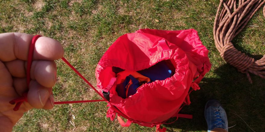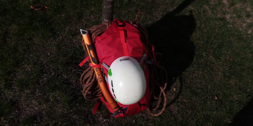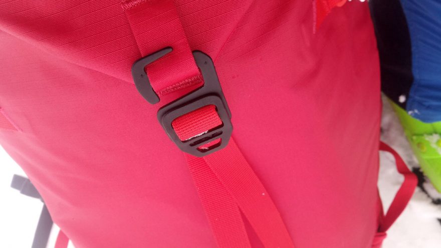 Na čelní panel batohu se přidělávají cepíny a na bocích jsou popruhy pro připevnění lyží. Cepíny se fixují velmi jednoduchým způsobem – systémem Headlocker. Hlavicí cepínu provlečete hliníkovou příčku na pružné tkanici. Zobáky jsou navíc jištěny kusem silné látky tak, aby přiléhaly k batohu. Topůrka se fixují pomocí horních kompresních popruhů, které jsou na čelním panelů založené a stahují tak perfektně topůrka cepínů. Stejně tak můžete fixovat i teleskopické hole. Pouze hrot holí založíte za gumičky systému Headlocker. Z boku je možno klasicky zastrčit lyže a to i takové, které narostly do šířky. Moje K2 Wayback se šířkou pod patou 106 mm se tam vklouzly jako kouzlo Vánoc. Spodní oko je hrubě zesíleno. Horní kompresní popruh zajišťuje lyže ve svislé pozici. Osobně ještě lyže stahuji přes špičku do typického „Áčka“. Pod vrchlík je možno díky integrovanému popruhu fixovat lano tak, aby nesjíždělo. Jinak mačky nebo jiná výzbroj musí do batohu, který díky objemu 40 lit. toho zvládne odnést docela hodně.