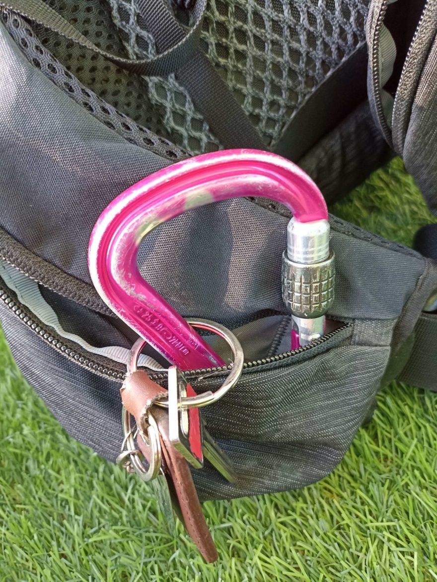 V horní části batohu je malá kapsička na zip, uvnitř ní je háček na klíče. Ideální místo pro telefon, či peníze. Zapínací kapsy na obou stranách bederního pásu jsou dostatečně velké pro telefon či foťák, tak aby byly vždy a hned k dispozici.