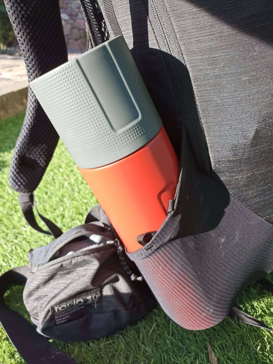 Na obou stranách batohu nechybí kapsa na lahev, kam se pohodlně vejde 1l láhev. V další boční kapse je uložena pláštěnka, jejímž případným vyjmutím se uvolní další zapínací kapsa.