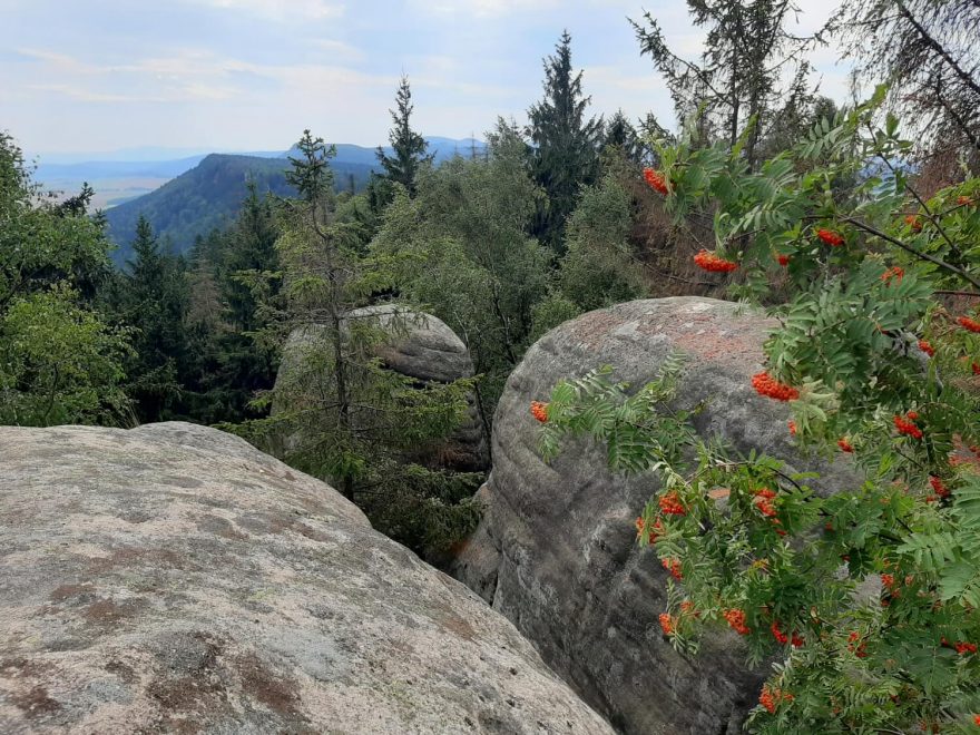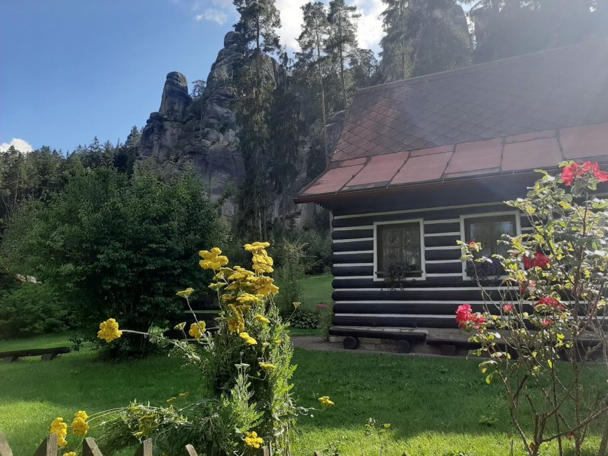 Osada Skály u zámečku Bischofstein leží na konci velmi krkolomné silničky, krom dvou restaurací a pár penzionů je tu skutečný konec světa. Jiráskovy skály působí v porovnání s monumentálností Adršpachu nebo Teplických skal komorním dojmem. Je tu však úžasný klid a lesy plné borůvek. Projít si tu můžete dva krátké okruhy – ke zřícenině hradu Skály a kolem Černého jezírka. Děti však nadchne veliké hřiště u zámečku, rodiče si tu můžou posedět u občerstvení… No zkrátka ideální odpočinkový den 😊