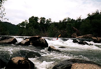 Doporučuje nám spodní úsek téměř až k jejímu ústí do veletoku Douro, ten prý je tak III-IV a jezdí se zde slalomy i rodeo. Vršek je prý excelentí, tak IV – VI+. A jen za malé vody! Tu máme, ale počasí pod psa a není čas. Budeme se sem muset vrátit. Ale i spodní úsek je krásný, vody dost, tekoucí voda se střídá s dlouhými peřejemi slibované obtížnosti. Jen jedno místo, asi po necelé hodině plavby, vypadá shora nevině. Matouš najíždí první, válec s ním práskne do skály, ještě vidím eskymáka a raději couvám z nájezdu a volím „dámskou cestu“ vpravo. Zespoda je vidět nádherný sifon (a dostatečně nebezpečný). Ještě že tak! Dál jet se nám nedaří, cesta zpět je daleká, ale řeka je tu spousta a všechny budou hezké. Dalších 1500 km do Francie k rozbitému autu, ještě vodácká radost na řekách Adour Lesponte a Adour (krásná IV-III s pěknou vodou) a dalších 1500 km domů, do Čech.