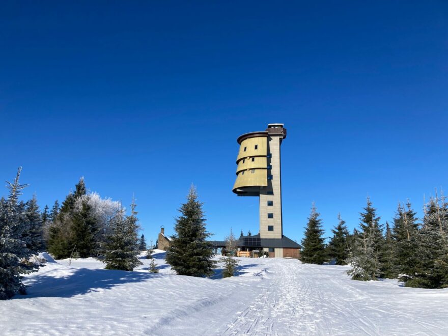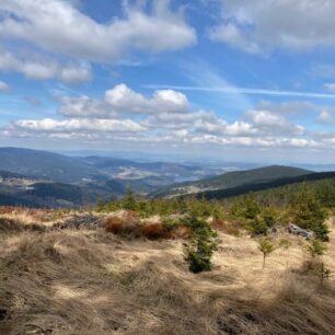 Další daleké výhledy nabízí rozhledna na vrcholu Poledník (1315 m), k níž vás zavede trasa z Prášil. Pěší varianta měří 18 km, na 22 km dlouhém okruhu pro běžky se navíc sklouznete po úbočí Jezerního hřbetu.