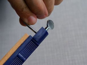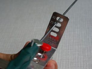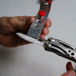 Použití je zcela jednoduché a právě v jednoduchosti je síla toho nástroje. Každý brusný kámen má v plastovém držáku otvor pro uchycení pevného vodicího drátu, který se pomocí šroubu zafixuje. Kámen se lehce potře olejem a je připraven k broušení. To by zatím nebylo nic tak zajímavého. Rozdíl od klasického plochého brousku je v držáku. Ostří nože se upne do držáku ze dvou duralových profilů ve tvaru L a dotáhne se, aby drželo na místě. Pak se vodicí drát na brusném kameni vloží do jednoho ze čtyř otvorů, jejichž výška definuje úhel, který bude brusný kámen svírat s upnutým ostřím. To je základní myšlenka celého nástroje – tím, že brusný kámen je veden pod stanoveným úhlem, bude ostří velmi dobře a přesně nabroušené, protože prostě vodicí drát neumožní úhel změnit, jak se může stát při ruční manipulaci na plochém brousku. Krásně jednoduché a funkční.