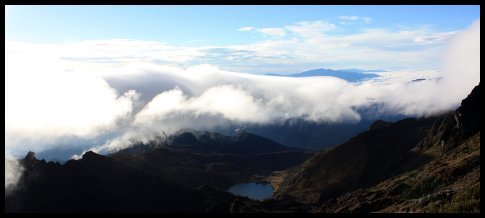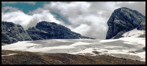 Cesta je neschůdná, ferrata je zpřetrhaná. Vedu cestu, ale zjišťuji, že dále to opravdu nepůjde, musíme stejně dolů na ledovec. Prošlapuji tedy cestu dolů prudkým svahem. Lezu pozpátku jako kočka. Mačkami zasekávám žlaby a postupně se dostávám dolů.