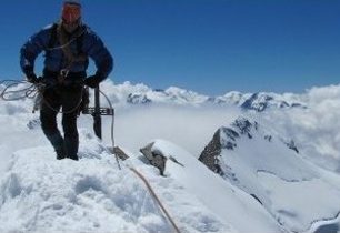 Půl hodinky po poledni jsme na vrcholu. Nádhera. Výška 4545 m n.m., což znamená, že z chaty to sem bylo rovných 1600 m výškových. Nalevo je v dálce neposkvrněná pana Jungfrau, kolem nás komplet Walliské Alpy a mezi Matternhornem a Dent Blanche vykukuje Mont Blanc. Ke kříži se po smrtelně vyhlížejícím hřebínku paradoxně slézá s kopce. Uděláme pár fotek a mažeme rychle dolů. Výška je znát, únava taky a do toho to zničující horko na rozpáleném a rozbředlém ledovci, kde se člověk nemůže svléknou.