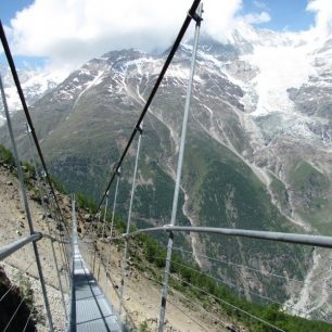 My po nočním přesunu a přebalení věcí v Taschi vyrazili pěkně po svých přímo z Randy na chatu Domhütte, což znamenalo převýšení 1400 m. Cesta stoupe pozvolna lesem až k lanovému mostu, který vede přes mohutný kuloár, kterým se řítí každou minutu mraky obrovských balvanů. Trochu to houpalo no, ale panoramata byla parádová. Pak přišla nařadu taková lehčí ferátka, kdy jsme museli zdolat skalní práh nahoru na chatu a už jsme byli na chatě. Pivečko v nás jen zasyčelo. Za chvilku byla večeře o čtyřech chodech, přesto měl Kozel stále ještě hlad.