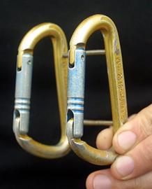 Loni jsem v Tatrách zahlédl zajímavou pomůcku, která usnadňuje manipulaci s jištěním při lezení v ledu. Na nošení trubkových šroubů do ledu, řečených též fréz, tu dva pražští horolezci Bobr a Kuba používali speciálně vyrobený držák či nosič, těžko říct, jak to pojmenovat (v angličtině často ice screw rack nebo také ice clipper či holder). Jak je patrné z obrázků, tvoří jej dvě karabiny, které jsou za svoji zadní část spojené dvěma dráty. Celý aparátek se připne na sedák za hlavní nosný popruh v pase. Fígl spočívá v tom, že dráty drží nosič v poloze, kdy karabiny trčí do prostoru kolmo k rovině těla. Frézy se tak na něj dají bez problémů a velmi rychle zavěšovat, a hlavně velmi rychle sundávat.