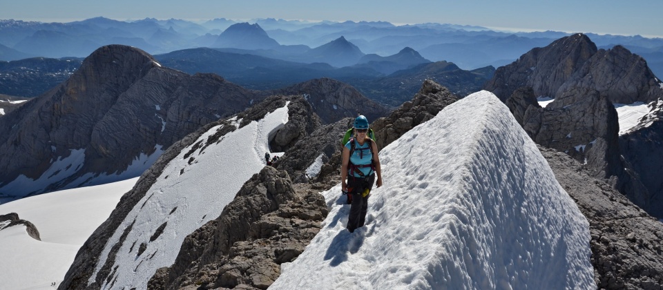 Ráno si přivstáváme hodně brzy a lanovkou Dachsteinsüdwandbahn vyjíždíme do výšky 2700 m na vrchol Hunerkogel. Čeká nás vrcholová třešnička v podobě výstupu na bezmála třítisícový Hoher Dachstein. Jeho vrchol vyčnívá nad ledovým příkrovem nejvýchodnějšího alpského ledovce, a tak se v letních měsících přístup stává poctivou ledovcovou turistikou se vším všudy – kvůli trhlinám není radno podceňovat navázání na lano ani umění zacházet s cepínem.